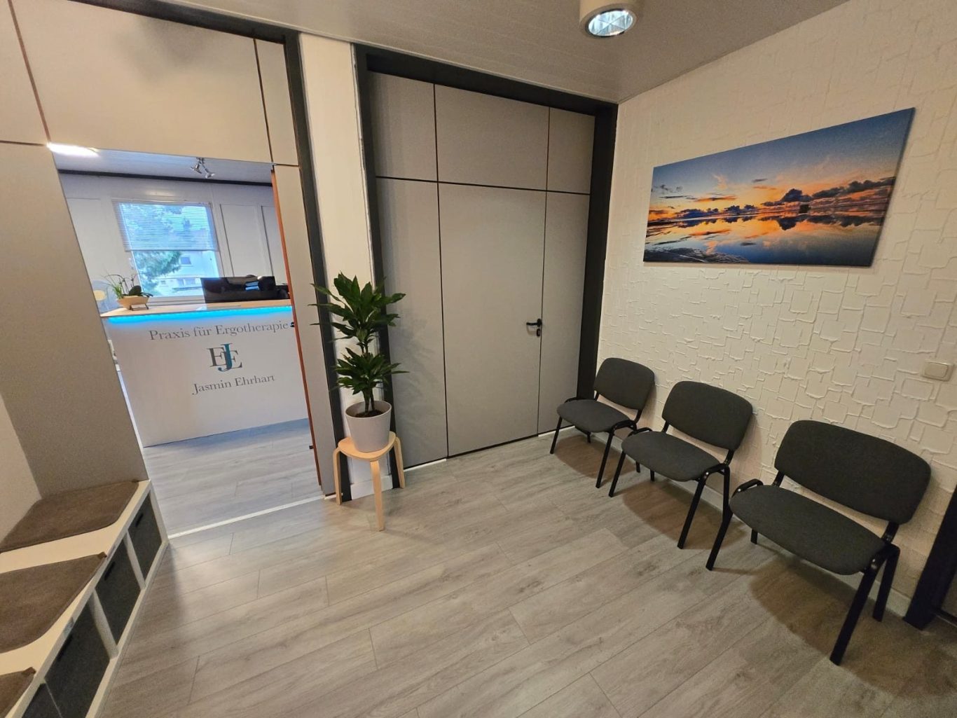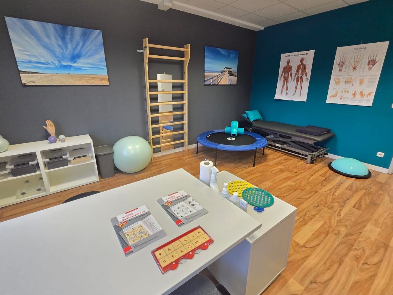 Herzlich Willkommen in unserer Ergotherapiepraxis! Unsere Praxis befindet sich im ersten Obergeschoss und bietet auf 210 Quadratmetern ausreichend Platz für Ihre Therapie. Wir verfügen über vier moderne Therapieräume, einen einladenden Wartebereich und eine freundliche Anmeldung. Das Highlight unserer Praxis ist unser großzügiger Motorikraum mit 70 Quadratmetern, der für vielfältige Bewegungsangebote sorgt.